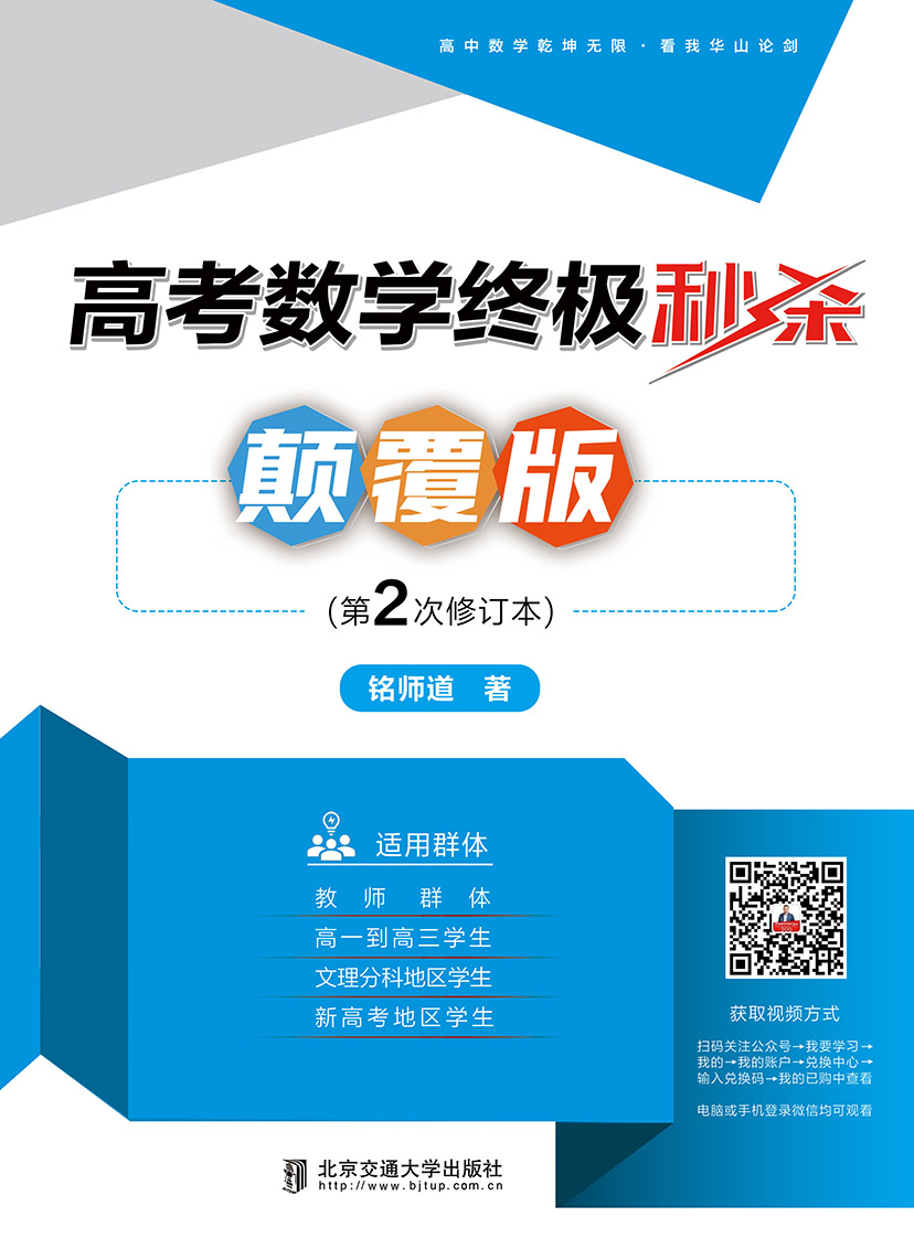 本书是以解题秒杀方式为载体,用网课语言和风格编写的适用性强的高中数学秒杀辅导用书。本书基于“跟谁学”在线教育网站教学实践,面向120分以上的学生群体, 同时对公立学校一线教师及网校、辅导班高中数学老师也有一定的启发和借鉴意义。希望此书可以引领一种新的学习思路——用秒杀的方式讲解一些对学生真正有用的、有些深度的、能引发学生思考的内容。本书共有六章,分别是:攻克高中数学之基、函数大板块、三角函数大板块、解析向量大板块、不等式大板块、立体几何大板块。本书所有题例的讲解基本为原创逻辑,并且尽量呈现逻辑严密步骤,同时本书解答风格网课化,不繁琐,不琐碎。